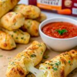 Delicious, golden brown Cheesy Stuffed Breadsticks filled with melted Monterey Jack cheese, brushed with a flavorful garlic butter, and served with marinara sauce for dipping. Perfect as a comforting appetizer or snack.