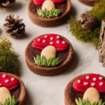 - Create the Mushroom Design: Divide a small portion of the dough and color it with red gel food coloring to make the mushroom caps. Shape small rounds with red dough and use white pearl sprinkles to mimic mushroom spots. Use green gel food coloring mixed with powdered sugar and a bit of heavy whipping cream to create green accents resembling grass.