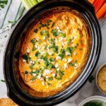 - Garnish and Serve: Keep the dip warm on low heat. Garnish with chopped green onions, additional crumbled blue cheese, and fresh cilantro or parsley if desired. Serve with your choice of chips, crackers, crostini, pretzels, or fresh vegetables such as carrots, celery sticks, and bell peppers.