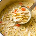 - Add Chicken, Dairy, and Noodles: Stir in the shredded cooked chicken, half-and-half or milk, and uncooked wide egg noodles. Cook for 10 minutes, or until the noodles are tender and the soup thickens.