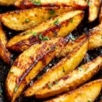 - Prepare Potatoes: Thoroughly scrub the russet potatoes. Slice each potato in half lengthwise, then cut each half into 3 or 4 wedges lengthwise at an angle, depending on the potato size.