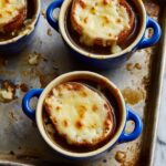 This rich and simple French Onion Soup is a comforting classic, featuring tender onions simmered in savory beef broth and enriched with a splash of dry sherry and dried thyme. Topped with crusty French bread and a combination of provolone, Swiss, and Parmesan cheeses, then broiled to bubbly perfection, it’s an ideal heartwarming dish for cold nights.