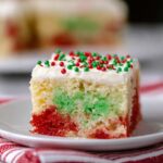 - Serve: Before serving, decorate the top of the cake with red and green sprinkles or other festive decorations for a cheerful holiday presentation.