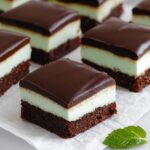 - Assemble the Brownies: Spread the mint buttercream evenly over the cooled brownies. Pour the chocolate ganache on top and gently spread to cover the entire surface.