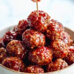 This Grape Jelly Meatball recipe features juicy, tender homemade meatballs coated in a sticky, sweet, and tangy sauce with a hint of heat. Made with a blend of grape jelly, barbecue sauce, red wine vinegar, soy sauce, and buffalo wings sauce, these meatballs are perfect as a crowd-pleasing appetizer or a comforting dinner served over mashed potatoes and veggies. They can be prepared on the stovetop or in a crockpot and are great for make-ahead meals or freezing.