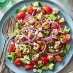 This 30-minute Greek-Inspired Dinner features grilled chicken marinated in a lemony, garlicky vinaigrette, served with fresh chopped vegetables and crumbled feta cheese. Perfect for a light, flavorful summer meal that's quick to prepare and easy to enjoy with grilled pita bread on the side.