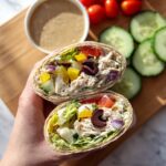 A vibrant and flavorful Greek Turkey Wrap with creamy hummus, fresh veggies, tangy feta, and zesty Greek vinaigrette all wrapped in a soft tortilla—perfect for a quick and delicious lunch.