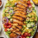 - Assemble Salad: On a large platter, layer the chopped romaine lettuce, cucumbers, cherry tomatoes, crumbled bacon, diced avocado, corn, and sliced red onion. Slice the cooked chicken cutlets and arrange them on top while maintaining their breast shape.
