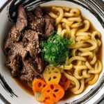 A comforting Japanese Beef Curry Udon recipe featuring thinly shaved wagyu beef, chewy premium udon noodles, and a rich Japanese curry roux with vegetables like carrots, onions, and optional lotus root slices. This dish combines savory curry broth with tender beef and fresh garnishes for a hearty meal.