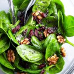 - Add toppings: Sprinkle the roughly chopped pecans and sweetened dried cranberries on top of the dressed spinach. Gently toss if desired or leave as a topping for presentation.