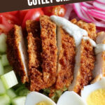 - Slice the Chicken Cutlets and Eggs: Cut the prepared chicken cutlets into slices or bite-sized pieces. Peel and quarter or slice the hardboiled eggs as preferred. Arrange on top of the salad vegetables.