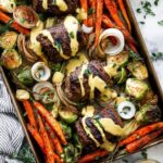 This Harvest Sheet Pan Chicken recipe is a simple and delicious dinner featuring tender boneless chicken breasts roasted alongside seasonal carrots, Brussels sprouts, and red onion. The vegetables and chicken cook together on one sheet pan for easy cleanup and perfect doneness. Finished with a flavorful homemade Maple-Dijon Dressing, this dish is perfect for weeknight meals or entertaining guests.