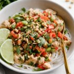 - Serve: Serve the Slow Cooker Thai Peanut Chicken over your choice of cooked rice, cauliflower rice, pad Thai noodles, or any favorite noodles. Garnish as desired and enjoy.