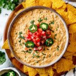 - Fresh garnishes like diced tomatoes and cilantro add color and brightness to the rich dip.